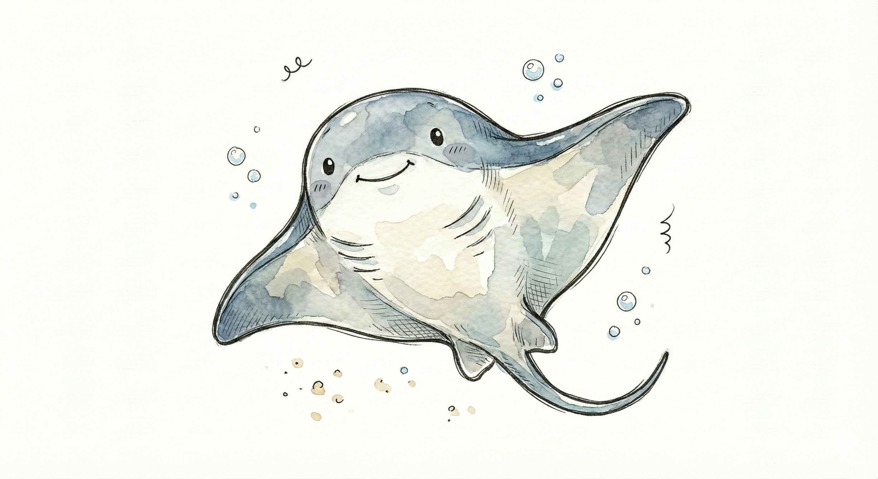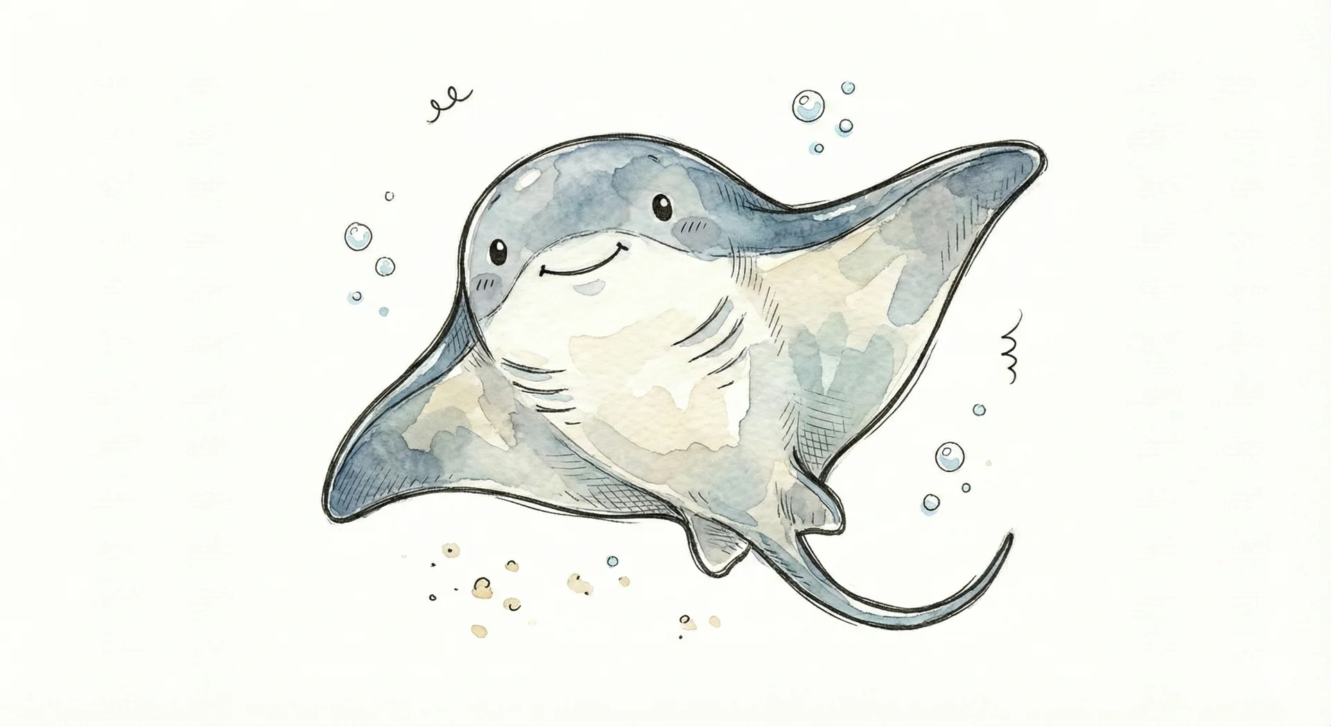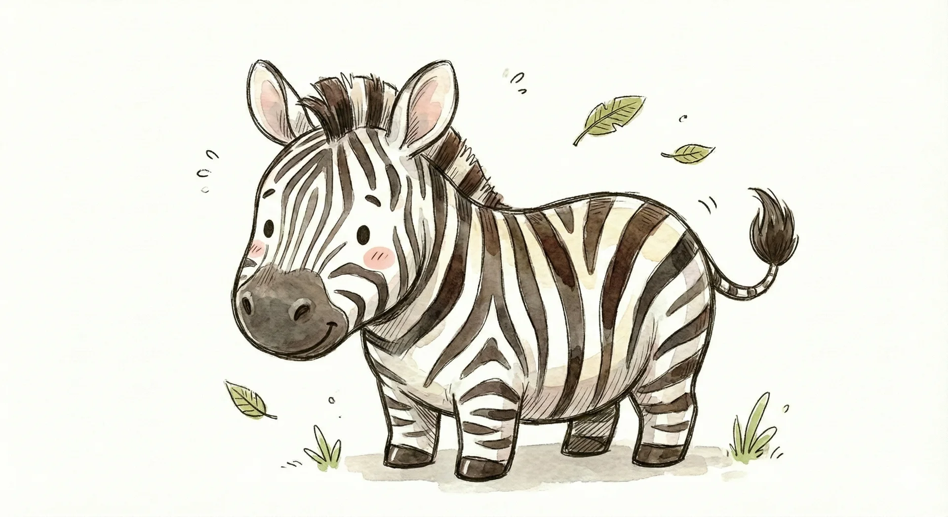 Niedliches, kindgerecht illustriertes Tier als einzelne, zentrierte Figur vor weißem Hintergrund, im frech-nordischen Aquarell-Skizzenstil. Klare, leicht wackelige Tuschekonturen, sichtbare Pinsel- und Strichtextur, dezente Schraffuren im Fell, weiche handgemalte Farbflächen in gedeckten Farben. Runde, einfache Formen, leicht überproportionaler Kopf, kleiner kompakter Körper, minimalistische Gesichtszüge mit zwei Punktaugen und kleinem Lächeln. Keine harten Schatten, sondern sanfte, transparente Aquarellschichten. Leicht raue, handgezeichnete Linien statt glatter Vektorkanten. Subtile, vereinzelte Kritzelpunkte oder kleine Details im Hintergrund, aber keine echte Szene. Figur steht oder schwebt mittig. Insgesamt charmant, humorvoll, warm und handgemacht wirkend, wie eine moderne Kinderbuchillustration auf weißem Hintergrund.