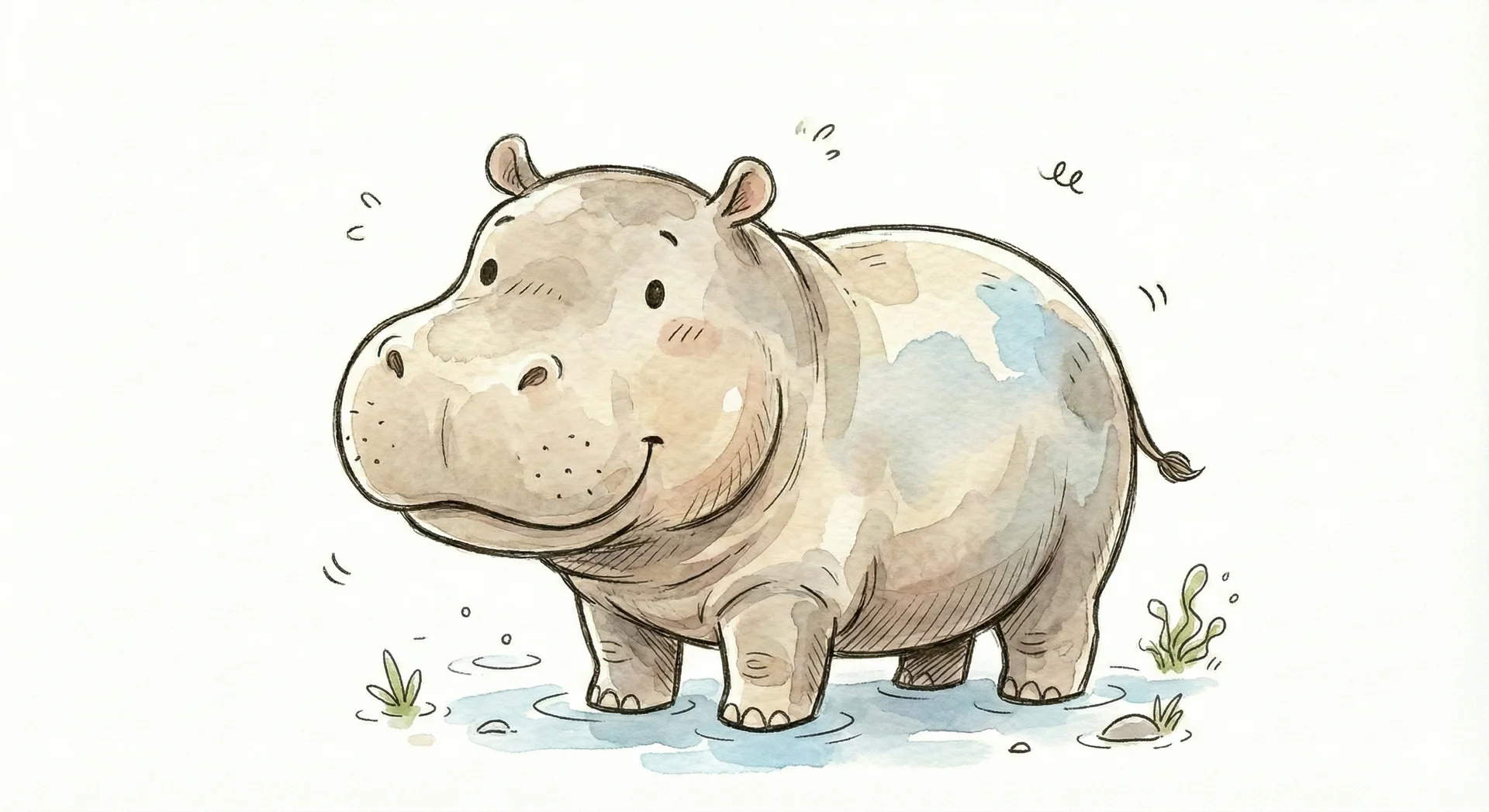 Ein niedliches, illustriertes Nilpferd steht fröhlich am Ufer.