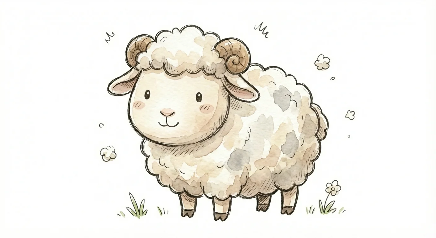 Niedliches, gezeichnetes Schaf mit lockigem Fell auf einer Wiese.