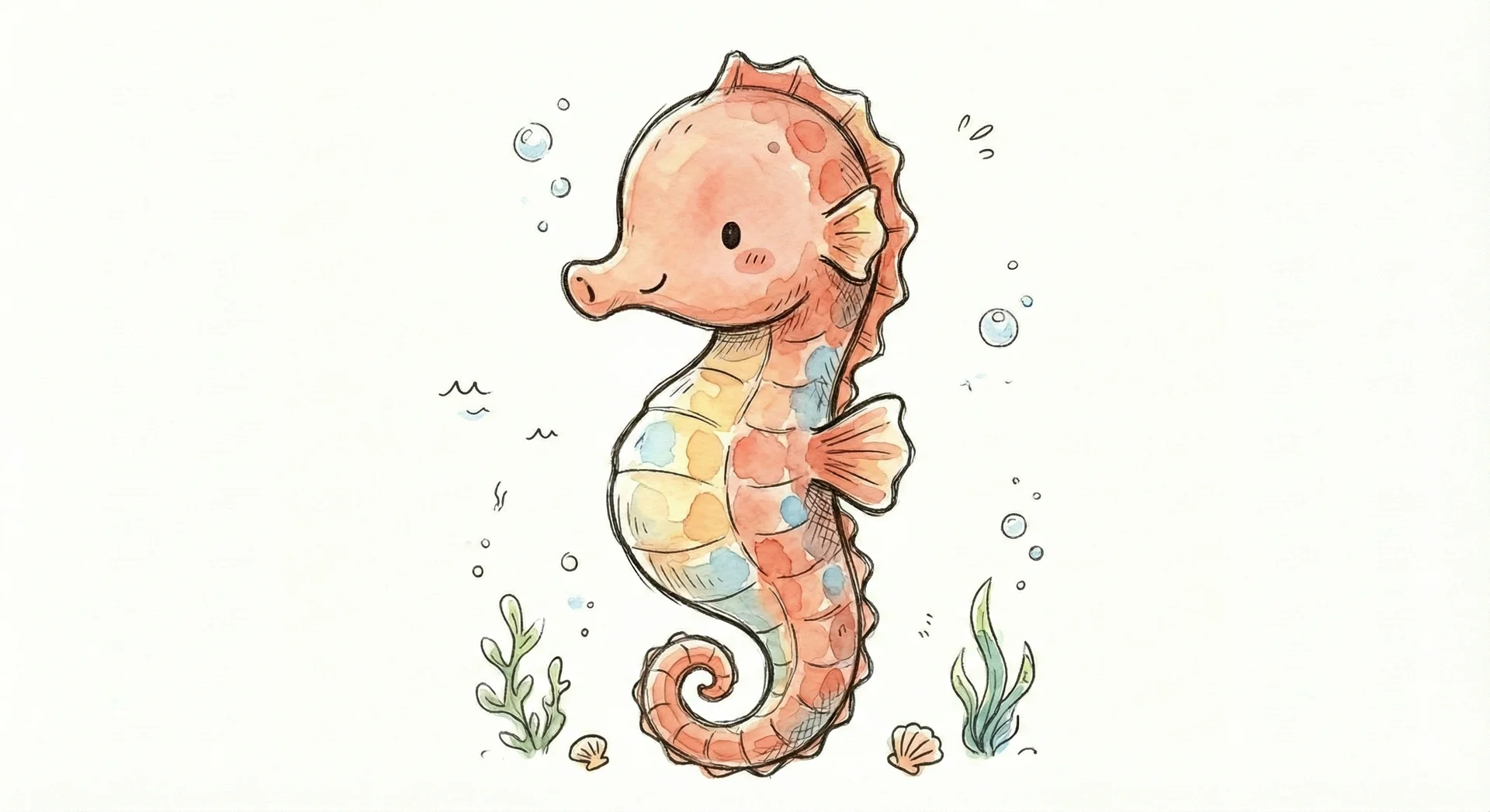 Ein niedlicher Seepferdchen mit bunten Schuppen und Blasen um sich herum.