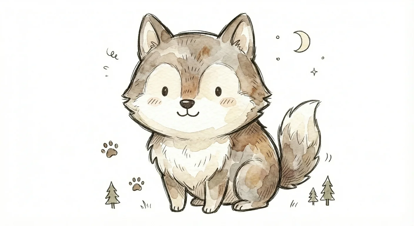 Niedlicher, gezeichneter Wolf mit freundlichem Gesicht und Waldmotiven.