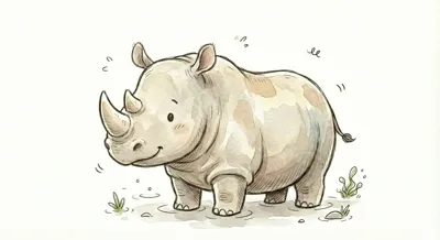 Ein lustiger, cartoonartiger Nashorn-Charakter auf einer Wiese.