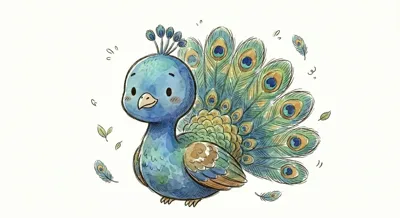 Ein niedlicher, cartoonhafter Pfau mit buntem Gefieder.