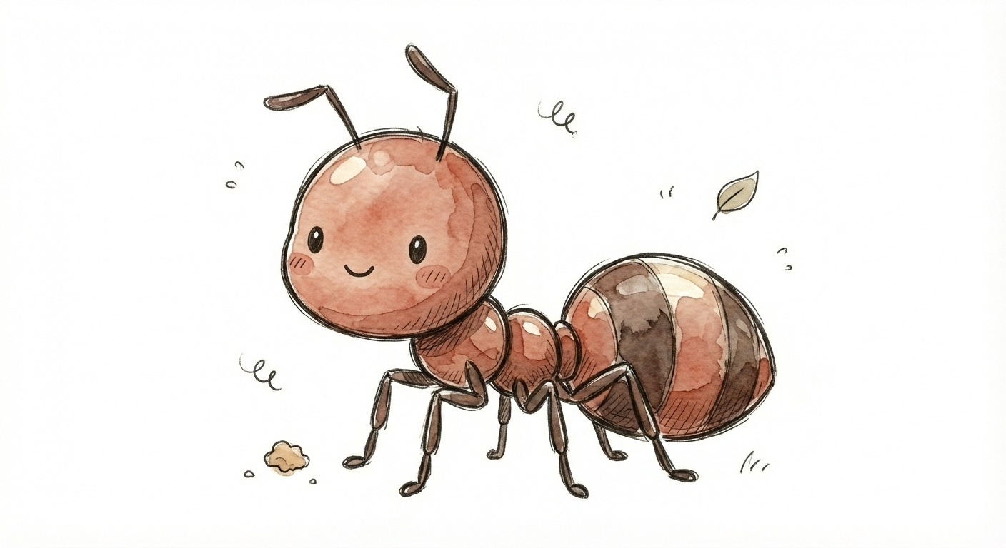 Eine niedliche, cartoonartige Ameise mit Kulleraugen und einem freundlichen Lächeln.