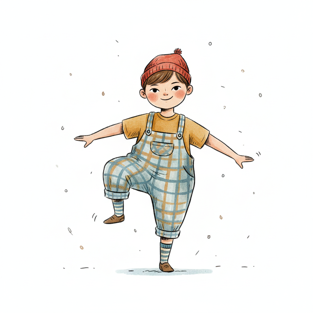Fröhliches Kind in Latzhose und Mütze balanciert spielerisch auf einem Bein.