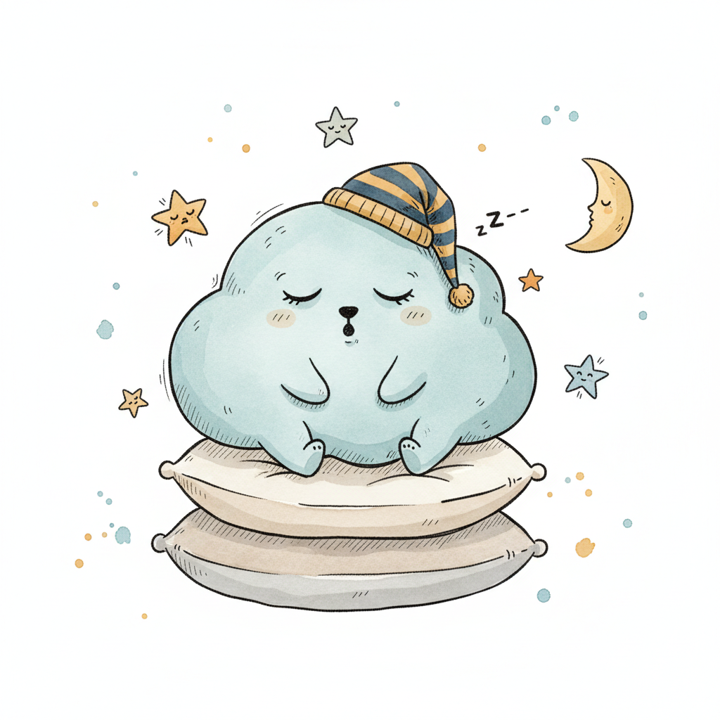 Eine schlafende, niedliche Wolke auf Kissen mit Schlafmütze und Sterne.