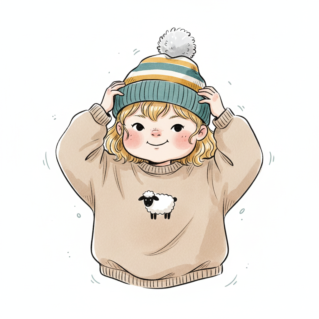 Ein Kind mit einem gestreiften Hut und einem Pullover mit Schafmotiv.