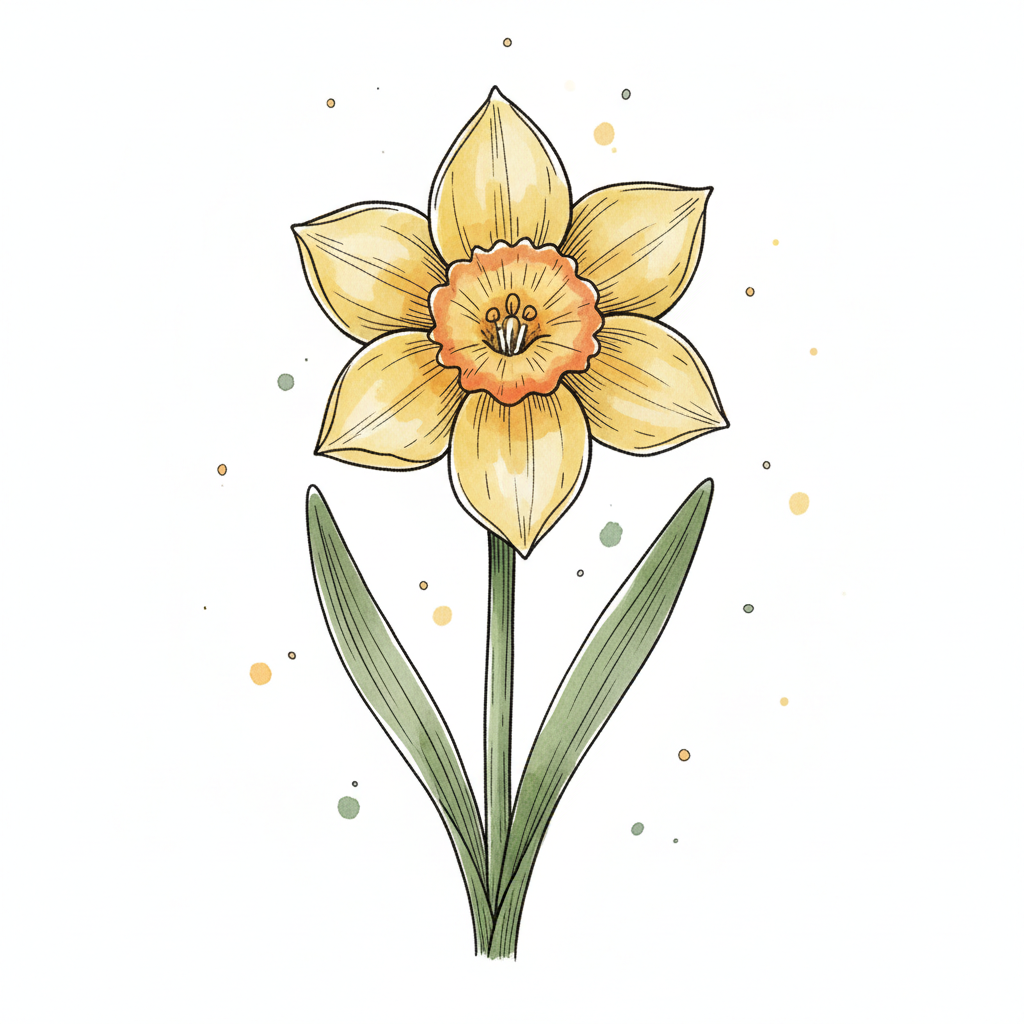 Eine gelbe Narzisse mit grünen Blättern und bunten Spritzern im Hintergrund.