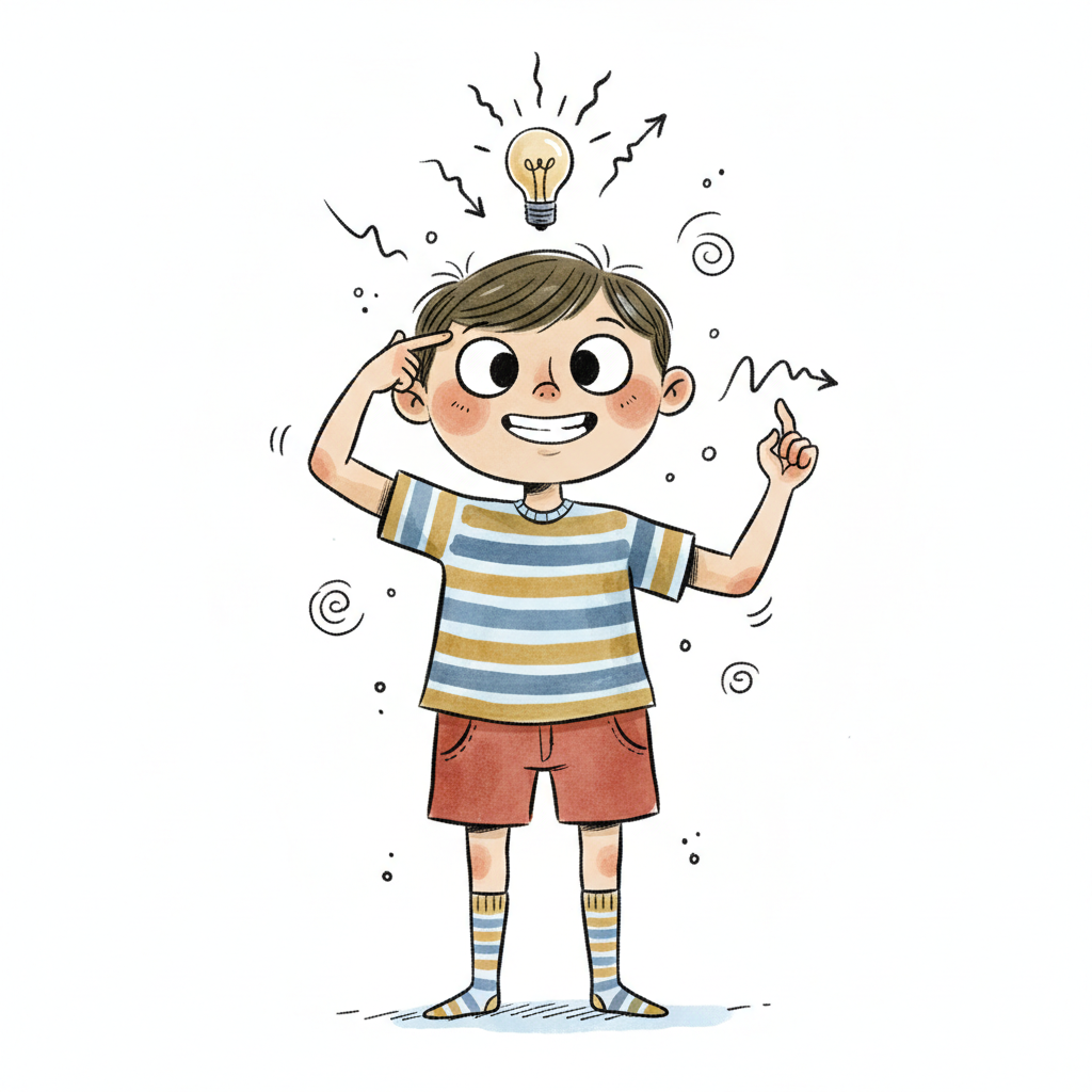 Ein fröhlicher Junge hat eine Idee, dargestellt durch eine Glühbirne über seinem Kopf.