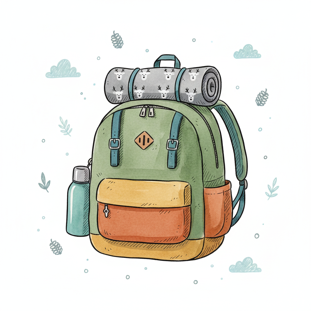Illustrierter grüner Rucksack mit Schlafmattte, Wasserflasche und Hirschmuster. Bereit für Abenteuer.