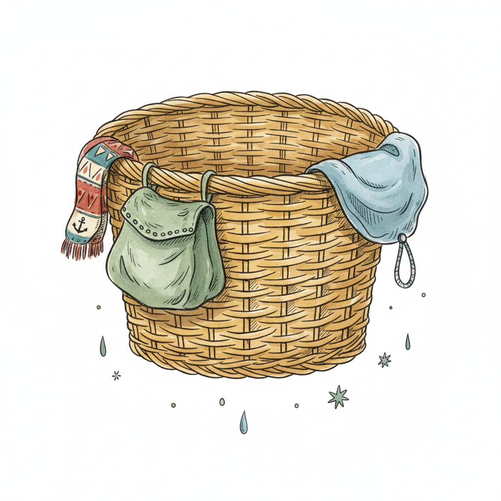 Illustrierter Weidenkorb mit Schal, Tasche und Tuch, umgeben von Regentropfen und Sternen.