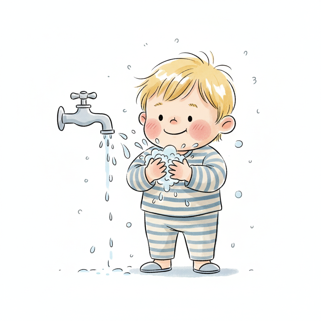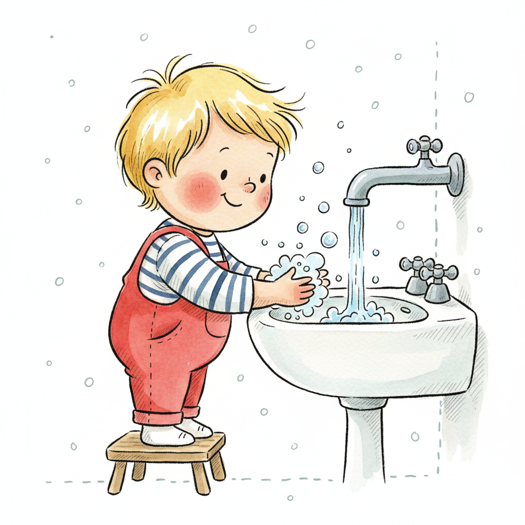 Fröhliches Kind wäscht Hände mit Seife und Wasser am Waschbecken, steht auf Hocker.
