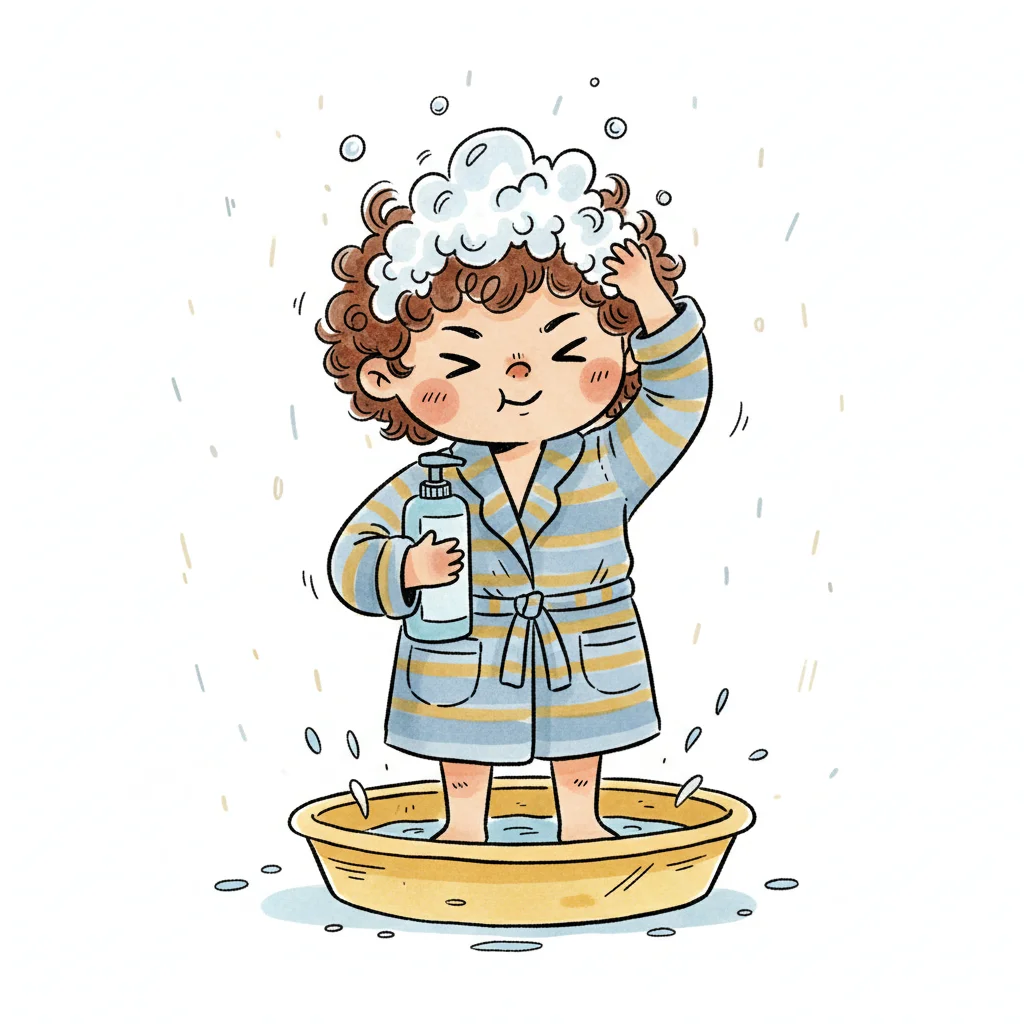 Fröhliches Kind mit Locken wäscht sich die Haare, trägt Bademantel und steht in einer Wanne.