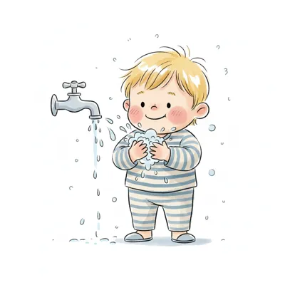 Ein lächelnder Cartoon-Junge öffnet eine Wasserflasche, aus der Dampf/Wasser entweicht.