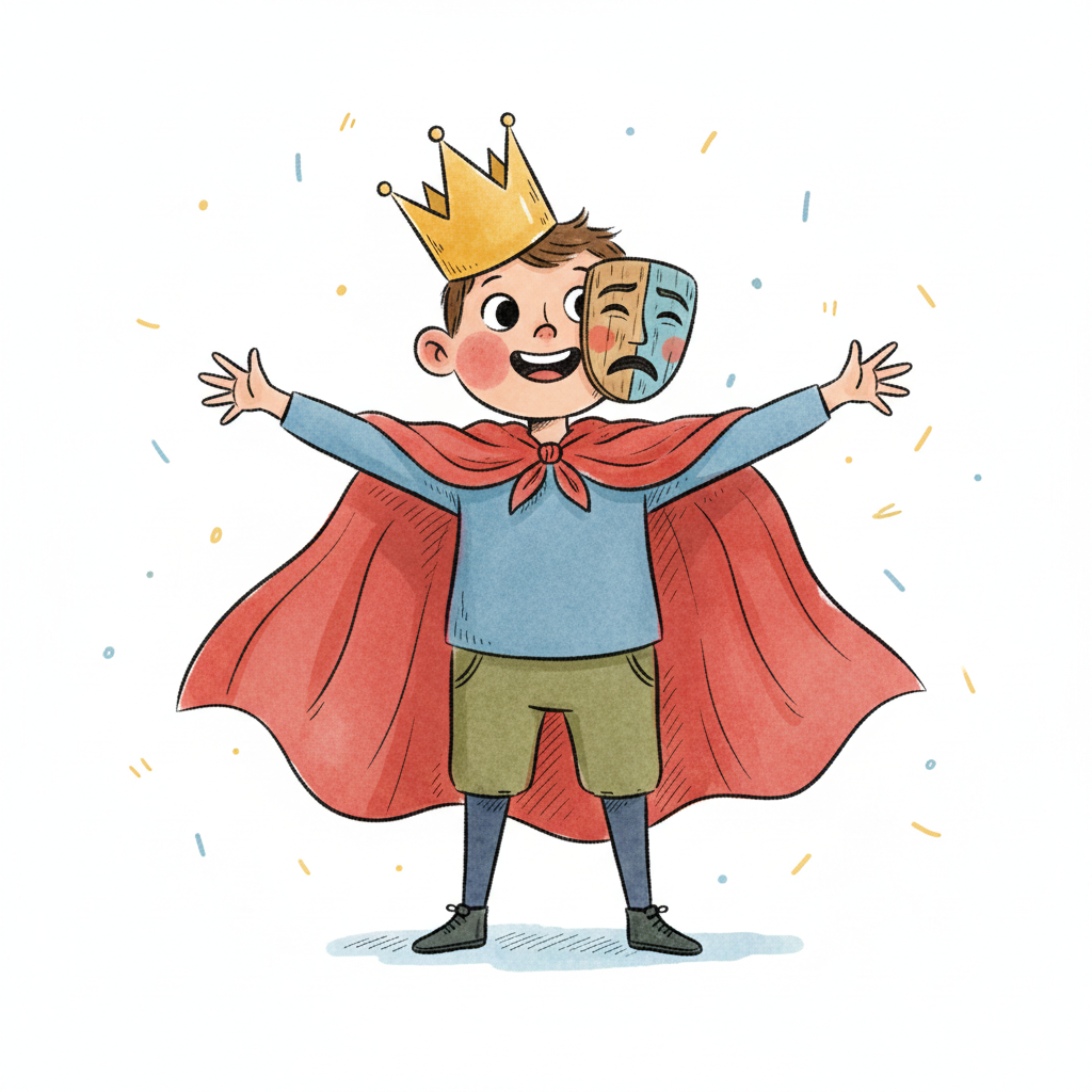 Junge mit Krone, rotem Umhang und Theatermaske, Arme ausgebreitet, lächelnd.