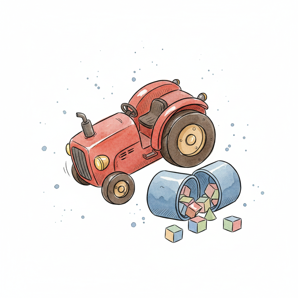 Roter Spielzeugtraktor und bunte Bauklötze, die aus einem umgekippten Behälter fallen.
