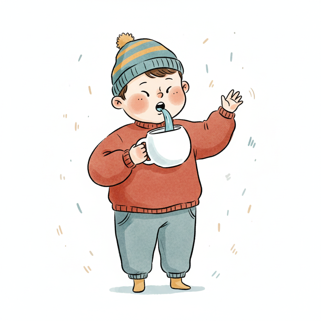 Niedlicher Cartoon-Junge mit Mütze trinkt aus einer Tasse, wobei Wasser verschüttet wird.