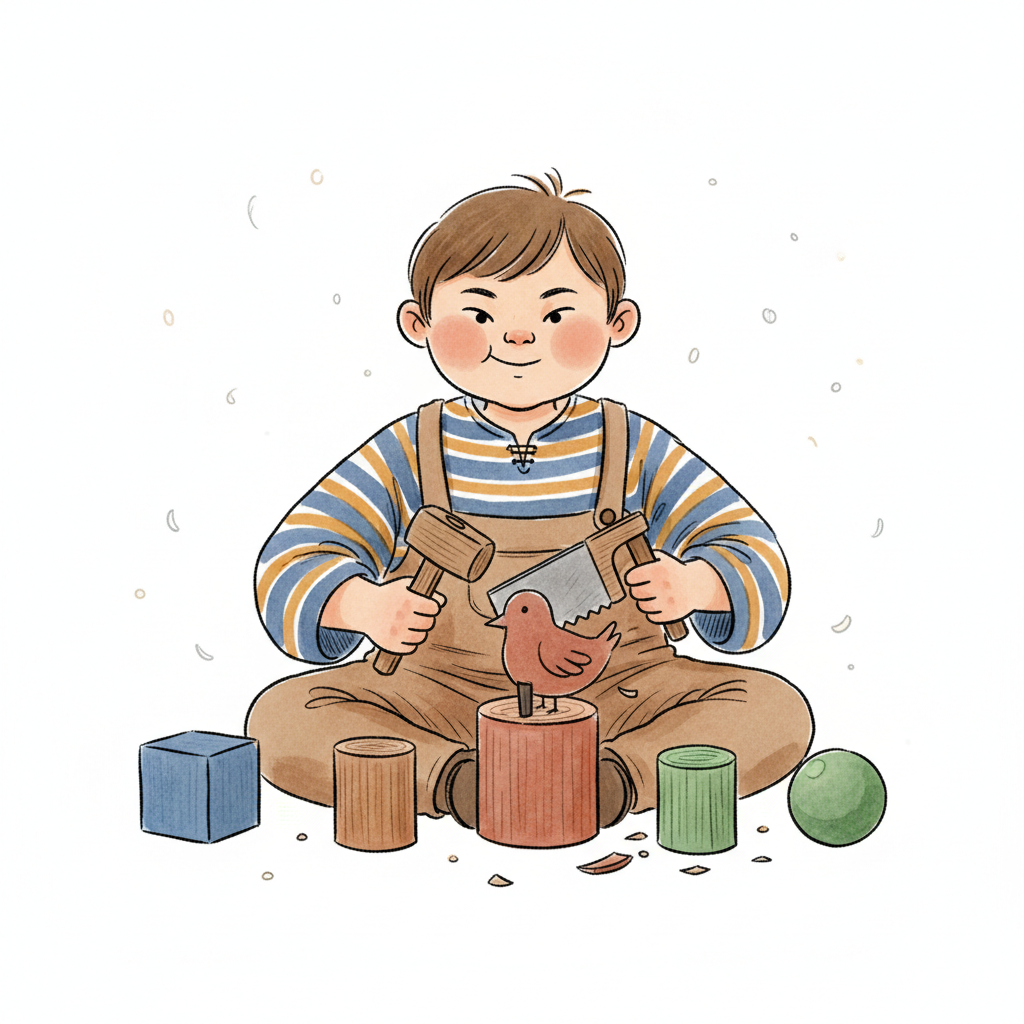 Fröhliches Kind schnitzt mit Spielzeugwerkzeug einen Holzvogel aus Bauklötzen.