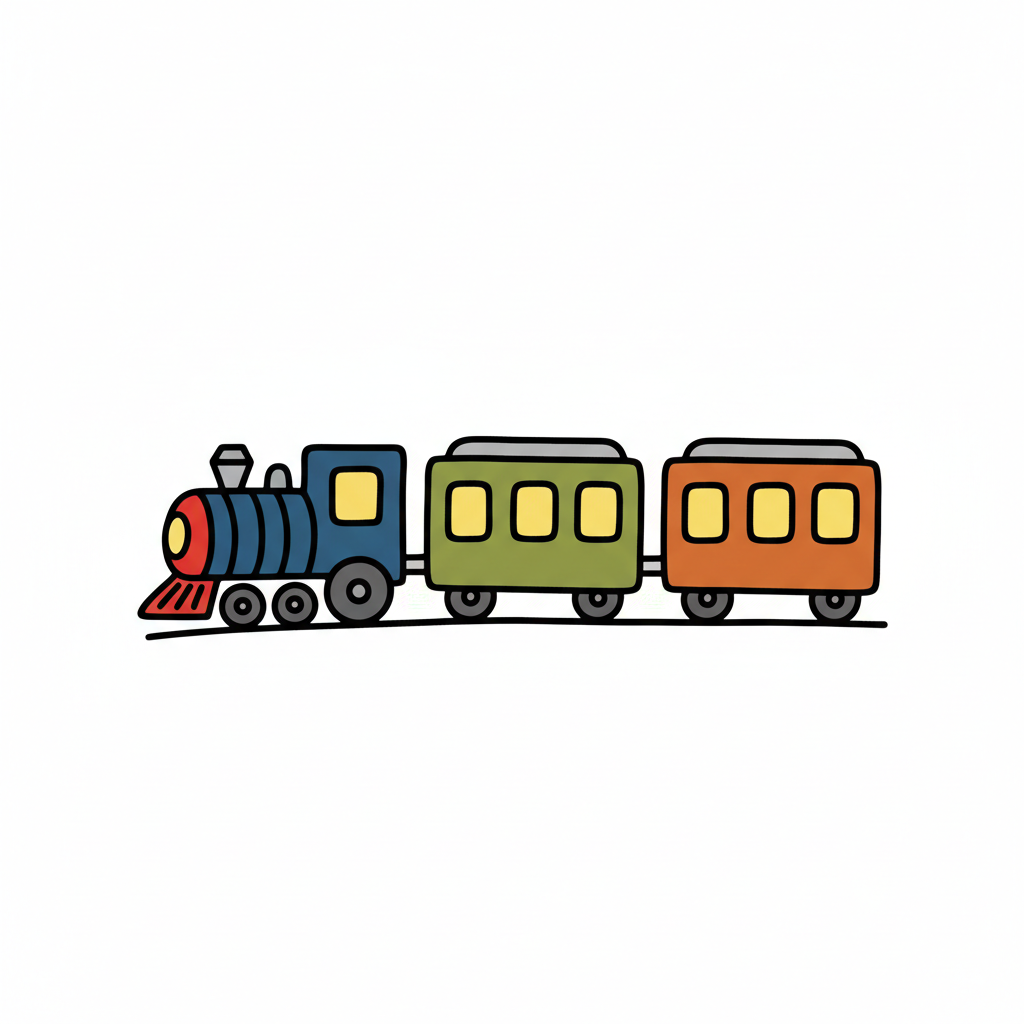 Buntes, handgezeichnetes Zug-Symbol mit Lokomotive und zwei Waggons auf weißem Hintergrund.