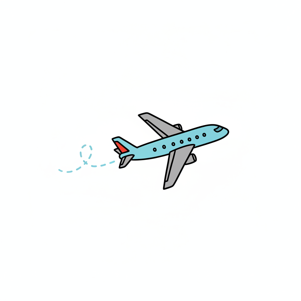 Hellblaues Cartoon-Flugzeug mit grauen Flügeln, das eine gestrichelte Flugbahn hinterlässt.