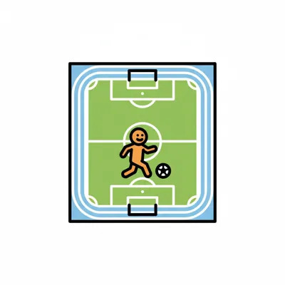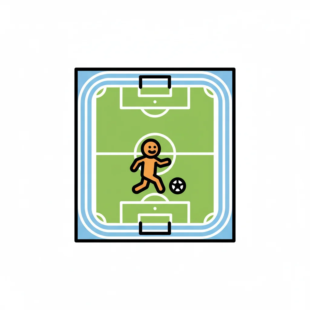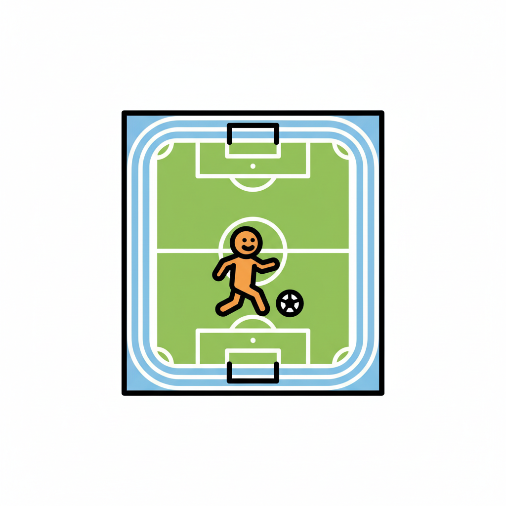 Stilisierte Draufsicht auf ein Fußballfeld mit Laufbahn und einer Figur, die einen Ball kickt.