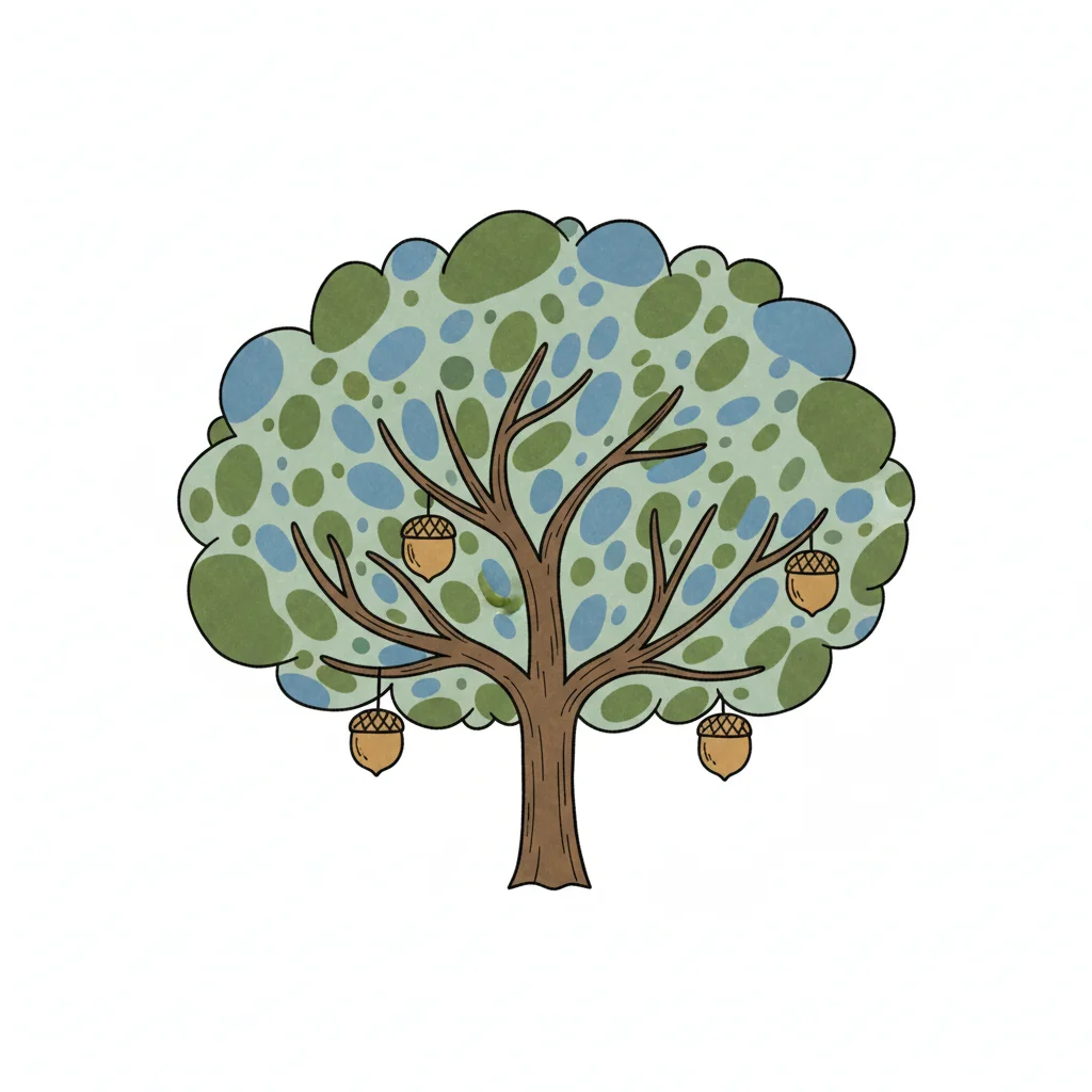 Ein bunter Baum mit Eicheln und stilisierten Blättern.