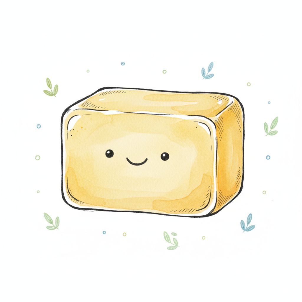 Eine fröhliche, gezeichnete Butter mit lächelndem Gesicht und Pflanzenresten.