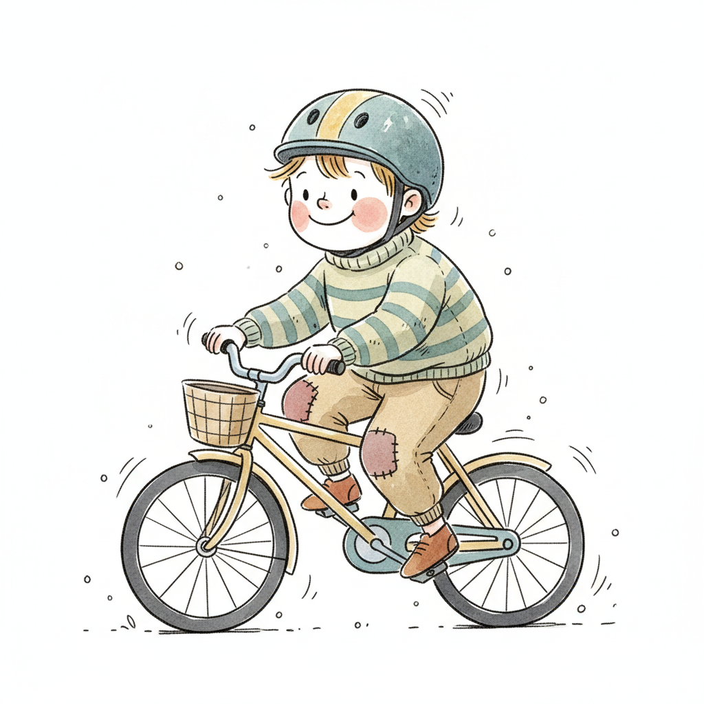 Fröhlicher Cartoon-Junge mit Helm fährt Fahrrad mit Korb.