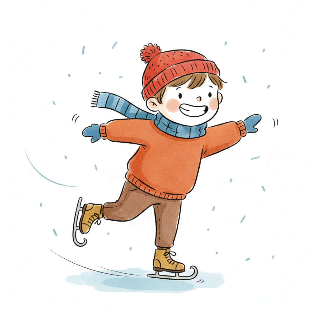Ein fröhlicher Cartoon-Junge in Winterkleidung beim Schlittschuhlaufen auf Eis.