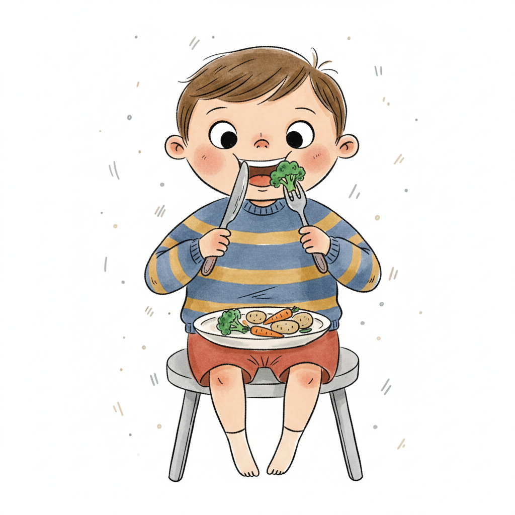 Ein fröhlicher Cartoon-Junge isst mit Messer und Gabel gesundes Gemüse von einem Teller.