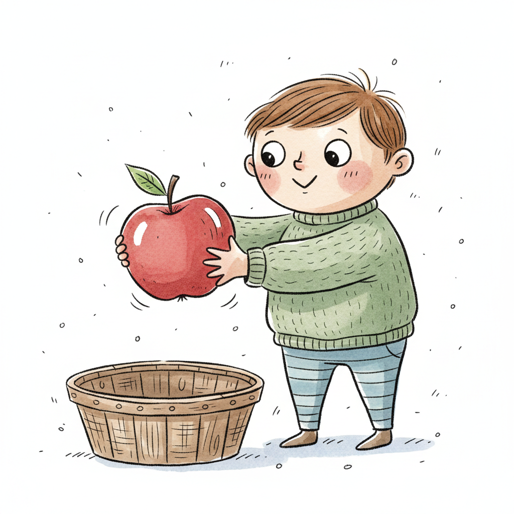 Ein lächelnder Cartoon-Junge hält einen großen roten Apfel über einem Korb.