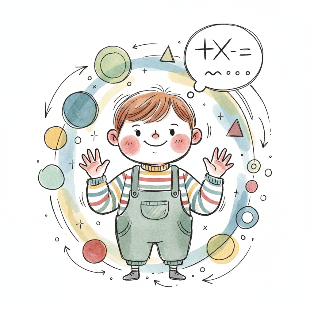 Niedlicher Cartoon-Junge umgeben von bunten Formen und mathematischen Symbolen, die er gedanklich verarbeitet.