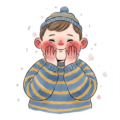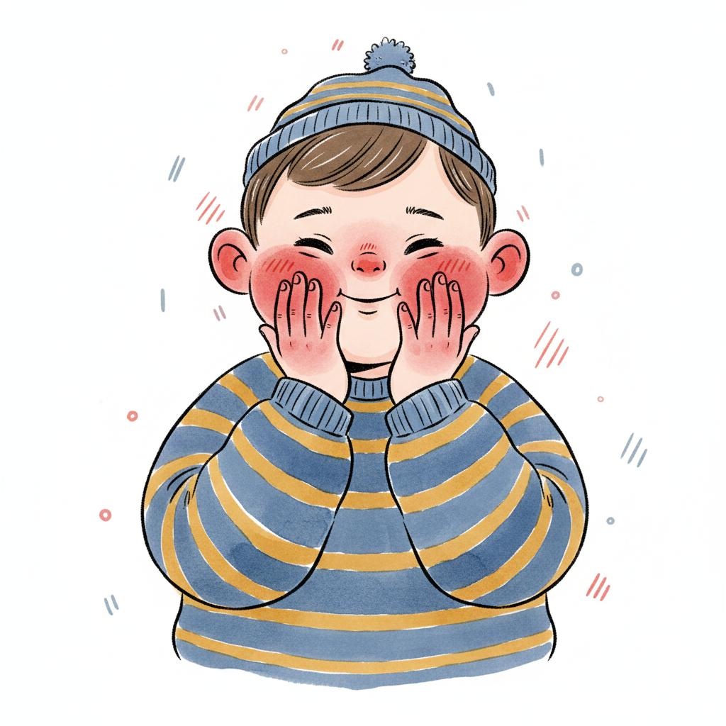 Niedlicher Cartoon-Junge mit roten Wangen, der glücklich in einem gestreiften Pullover und Mütze lächelt.