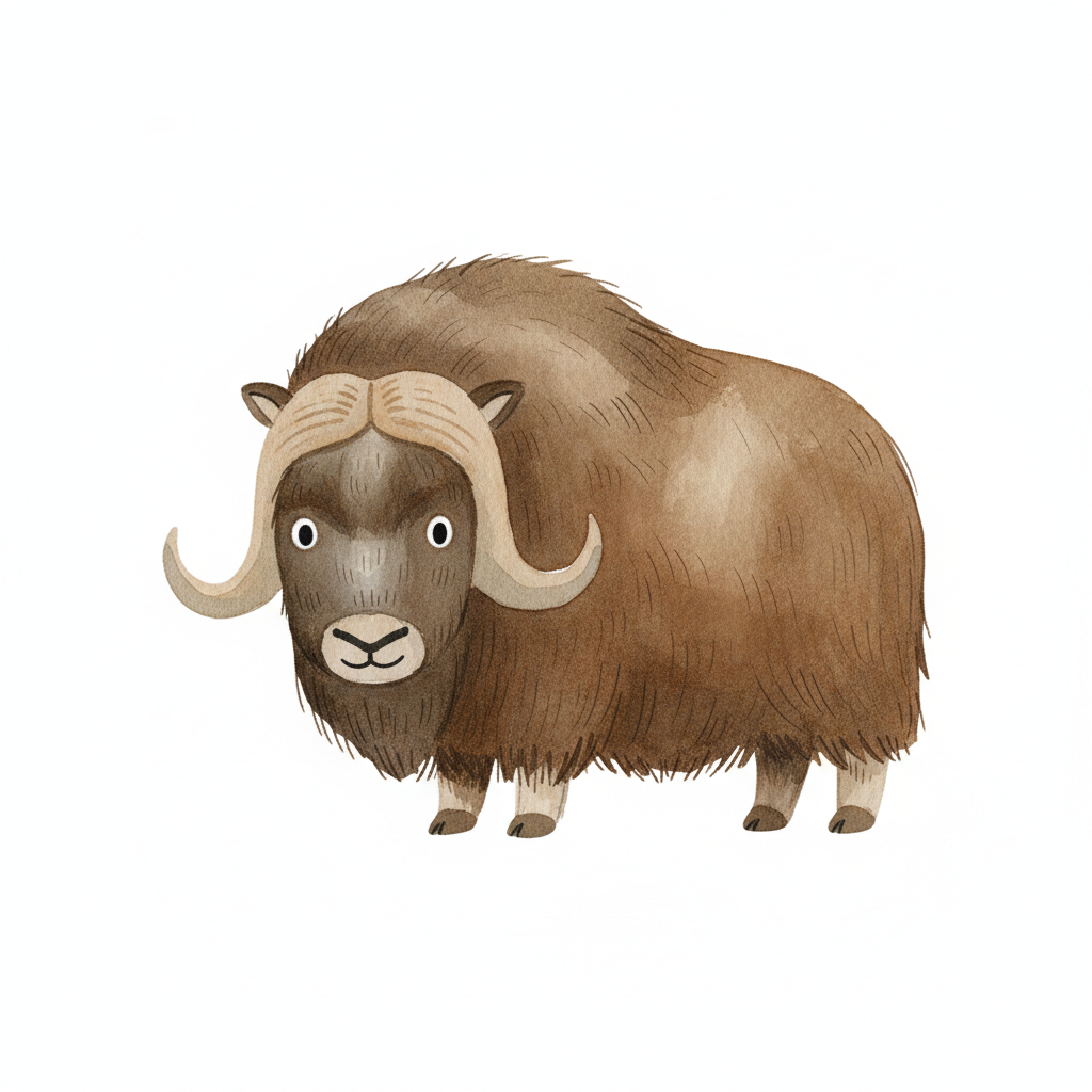 Ein niedliches, cartoonhaftes Yak mit dichten, braunen Fell und charakteristischen Hörnern.