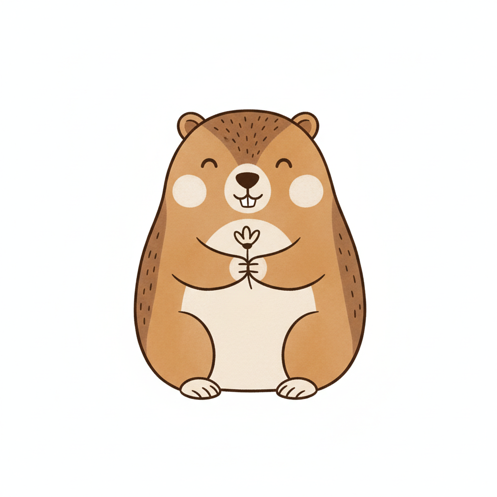 Ein süßes Tierchen hält eine kleine Blume in den Pfoten und lächelt.