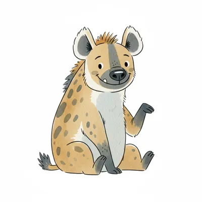 Ein fröhlich lächelnder Hyäne-Charakter sitzt mit erhobener Hand.