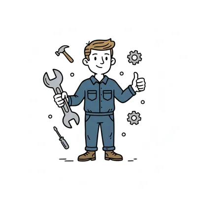 Ein Mechaniker mit Werkzeug, Daumen hoch und Zahnrädern im Hintergrund.