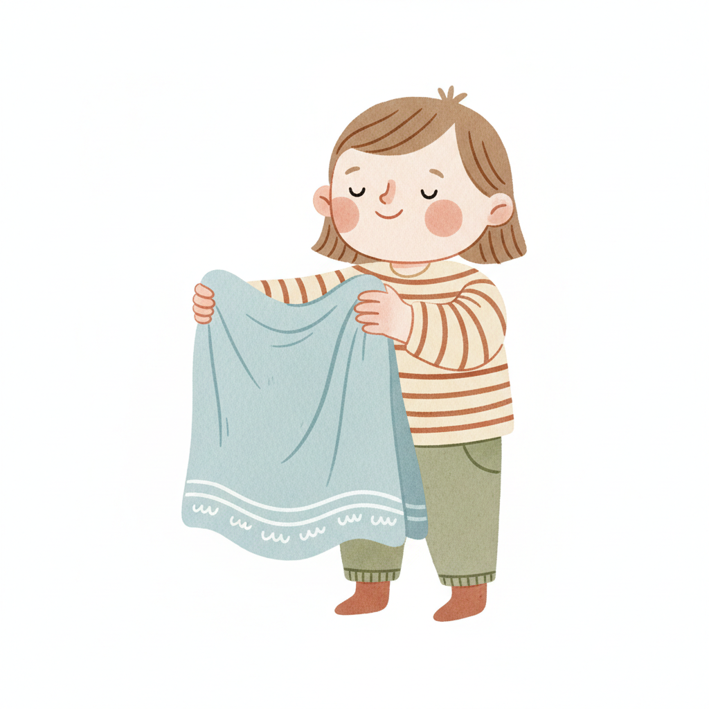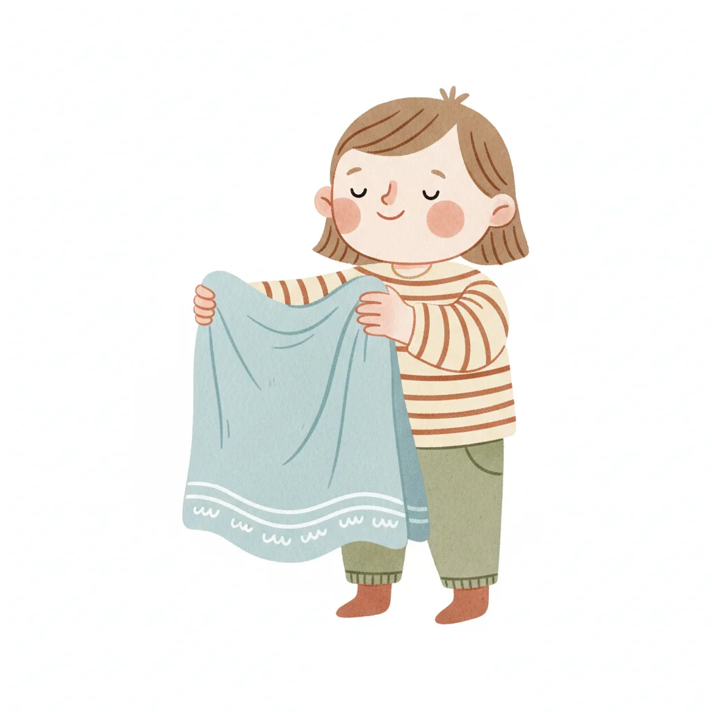 Ein fröhliches Kind hält eine Decke und lächelt.