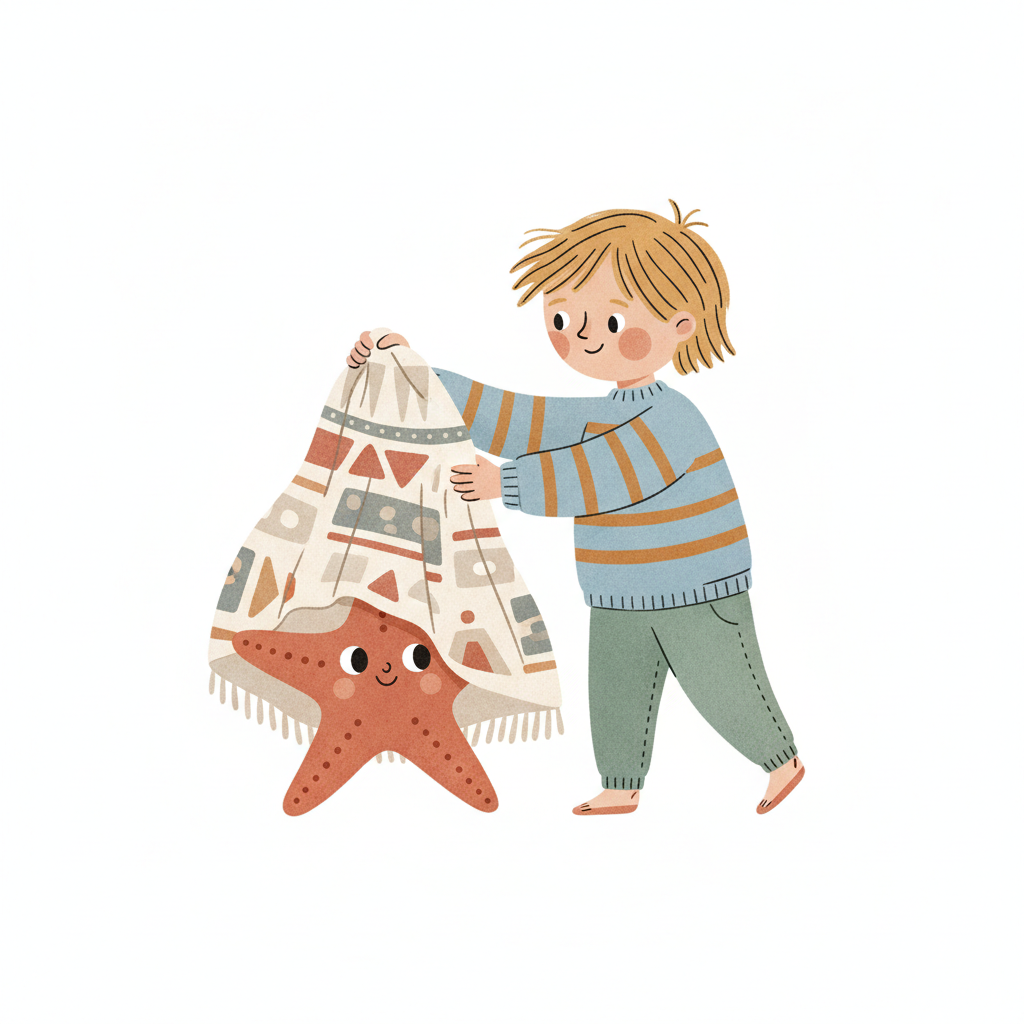 Ein Kind hebt eine Decke, darunter ein freundlicher Seestern.