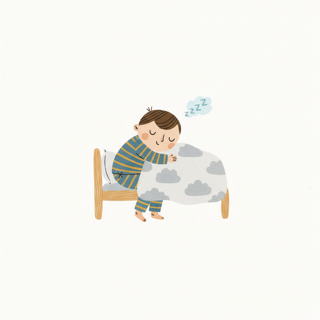 Ein schlafender Junge im Bett mit einem Wolkenmuster auf der Decke.