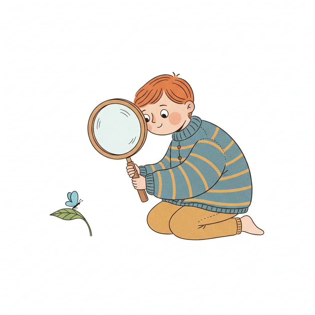 Ein Junge beobachtet eine Schmetterling mit einer Lupe.