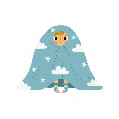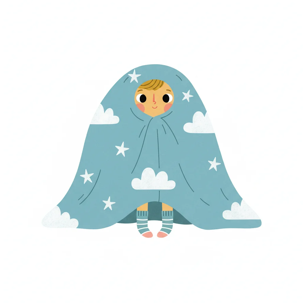 Ein Junge in einer Decke mit Wolken und Sternen sitzt fröhlich.