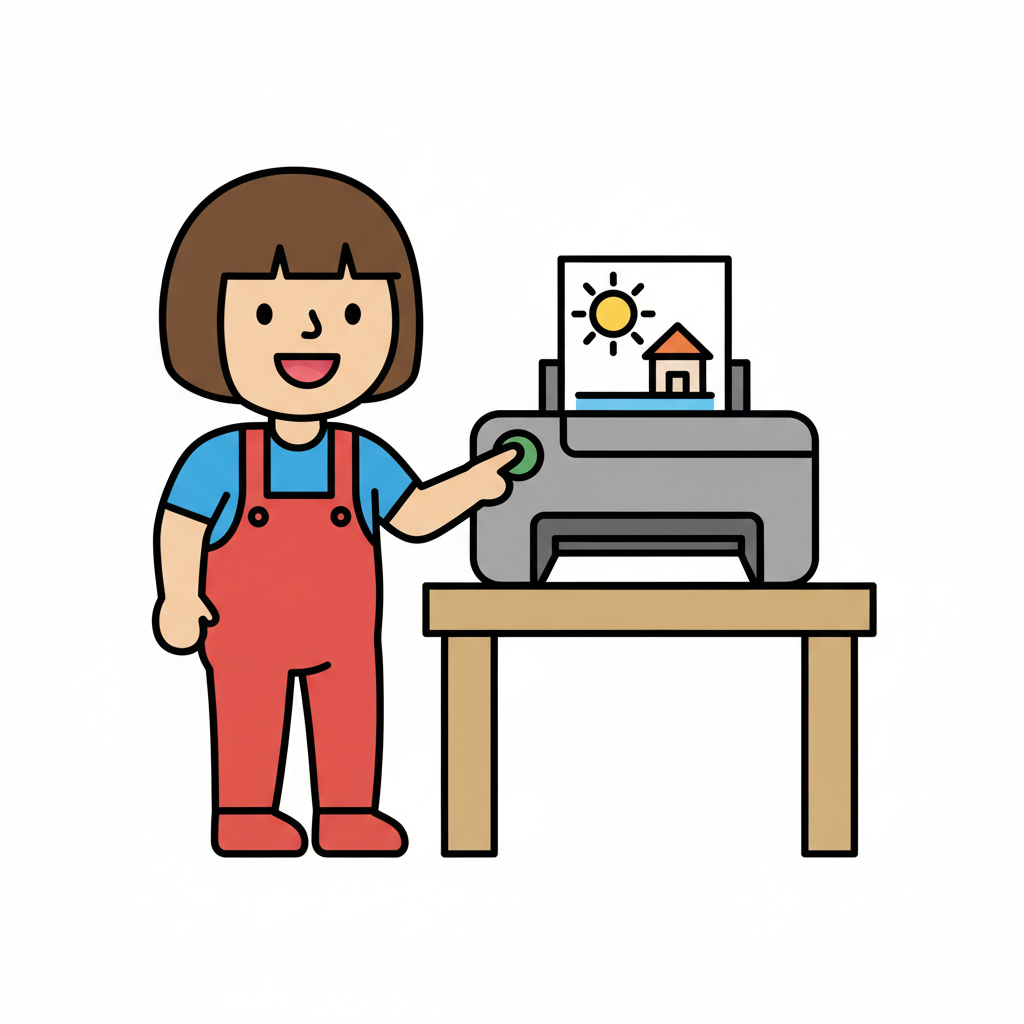 Ein lächelndes Kind druckt ein Bild von Sonne und Haus mit einem Drucker.