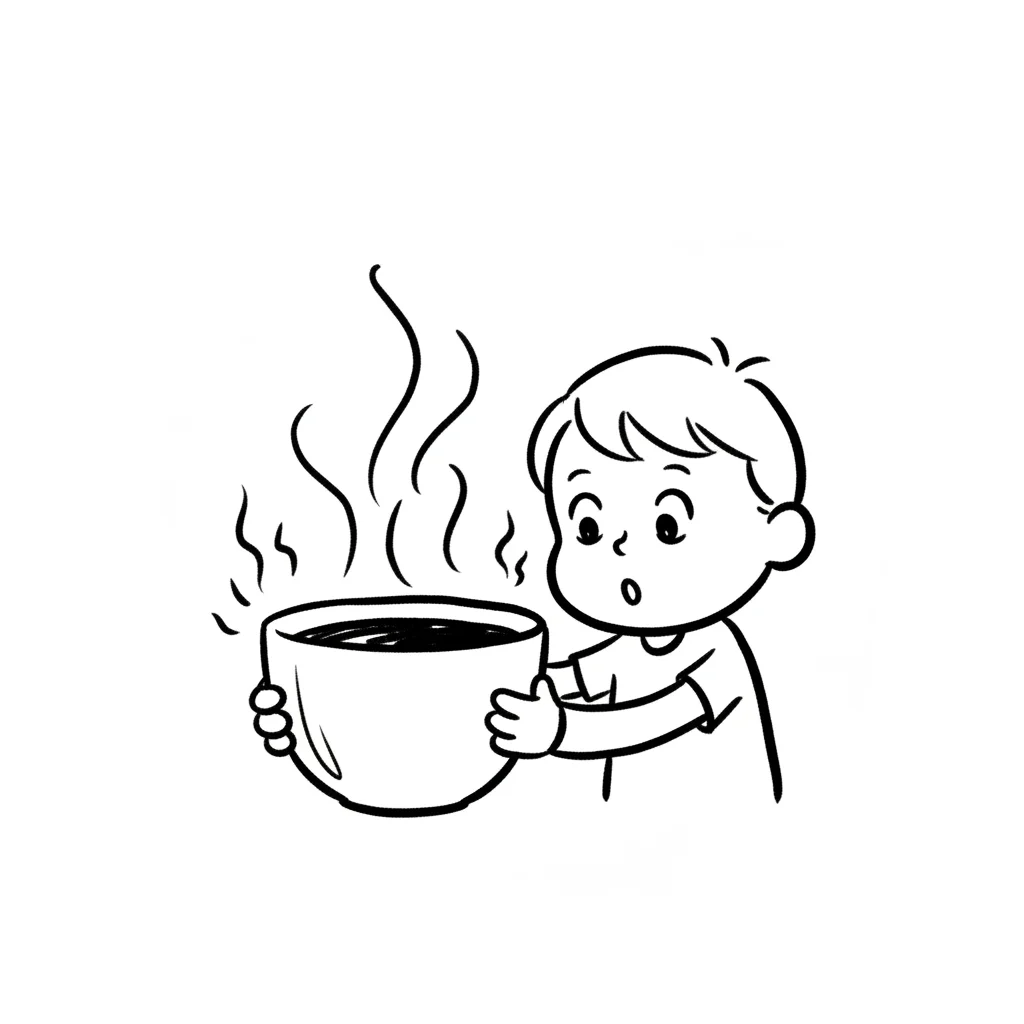 Schwarz-weißer Cartoonjunge hält dampfende Schüssel mit überraschtem Gesichtsausdruck.