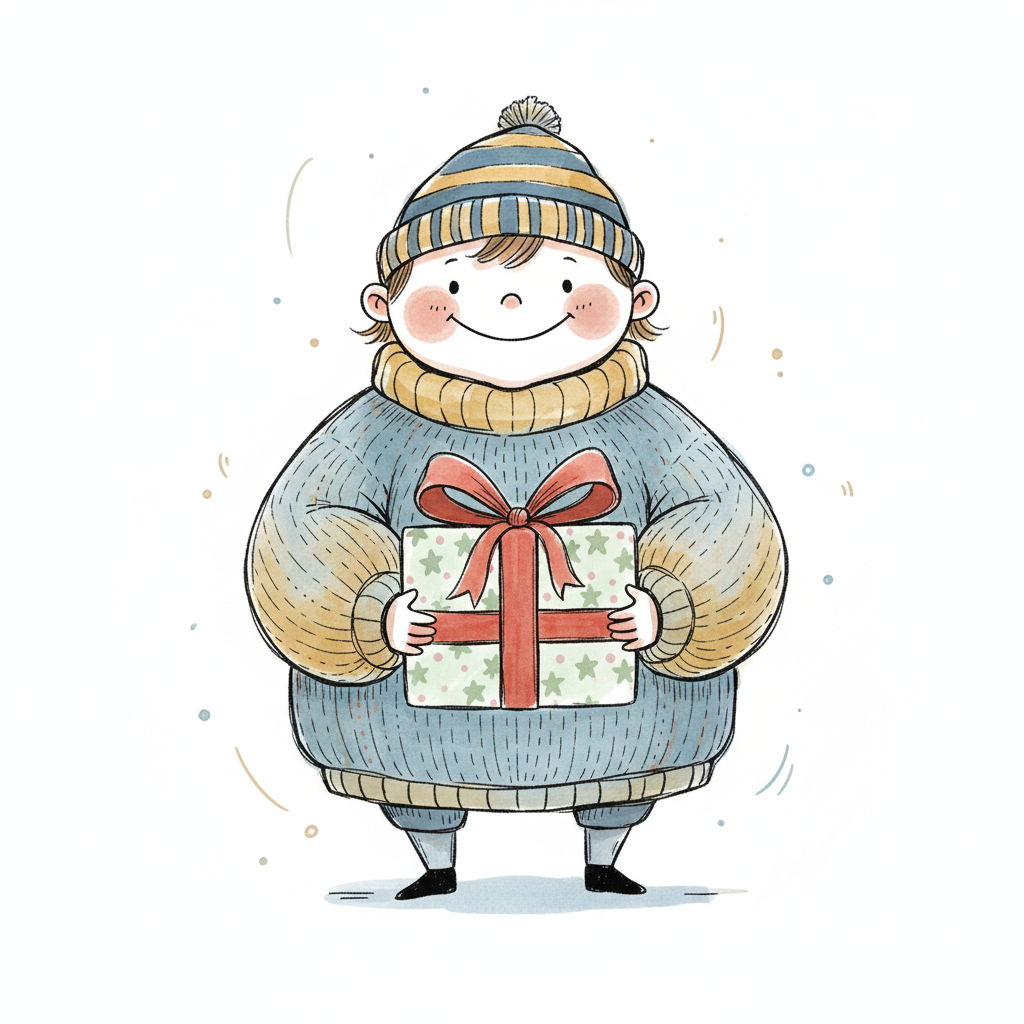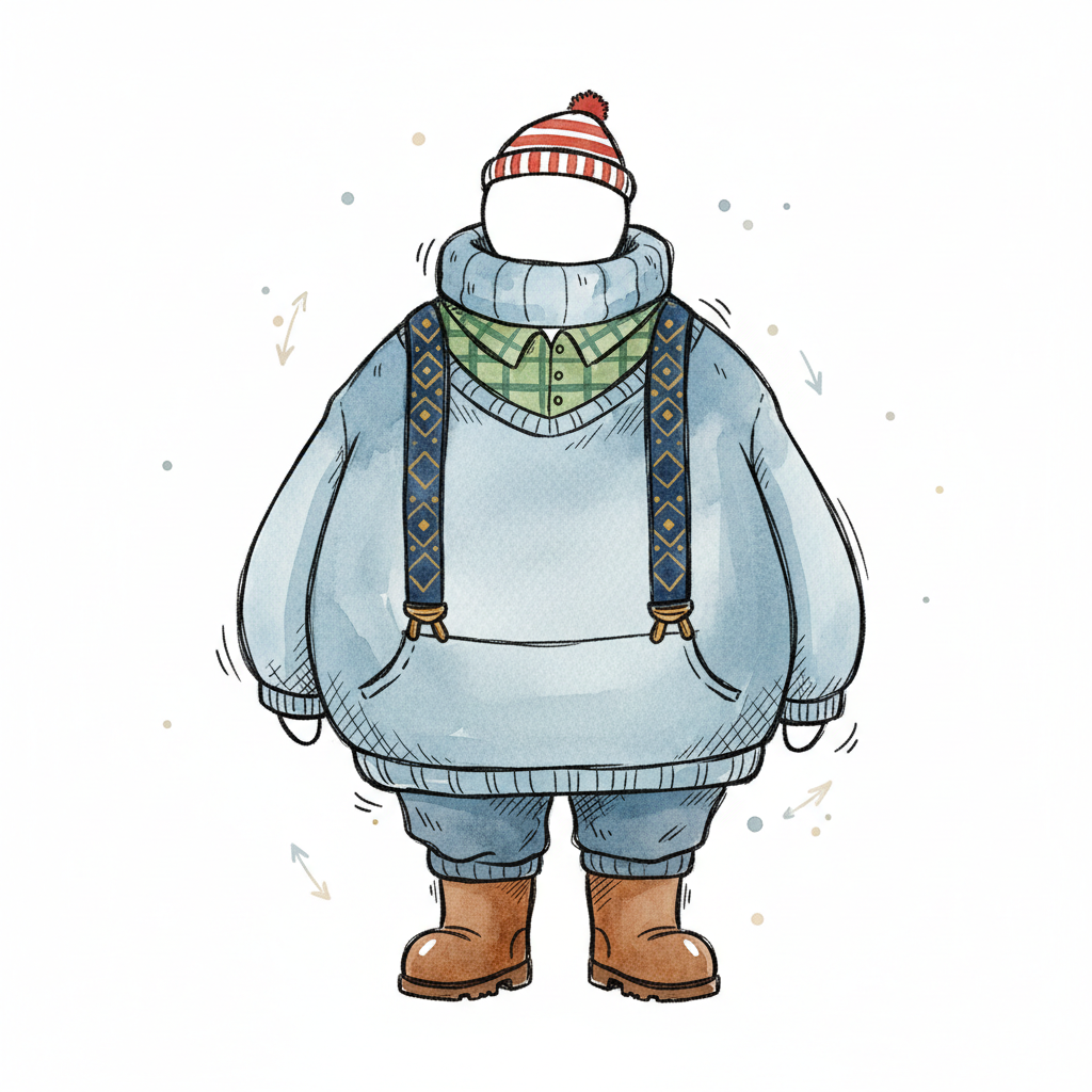 Niedliche Aquarell-Illustration einer faceless Figur in gemütlicher Winterkleidung mit Mütze, Pullover und Hosenträgern.