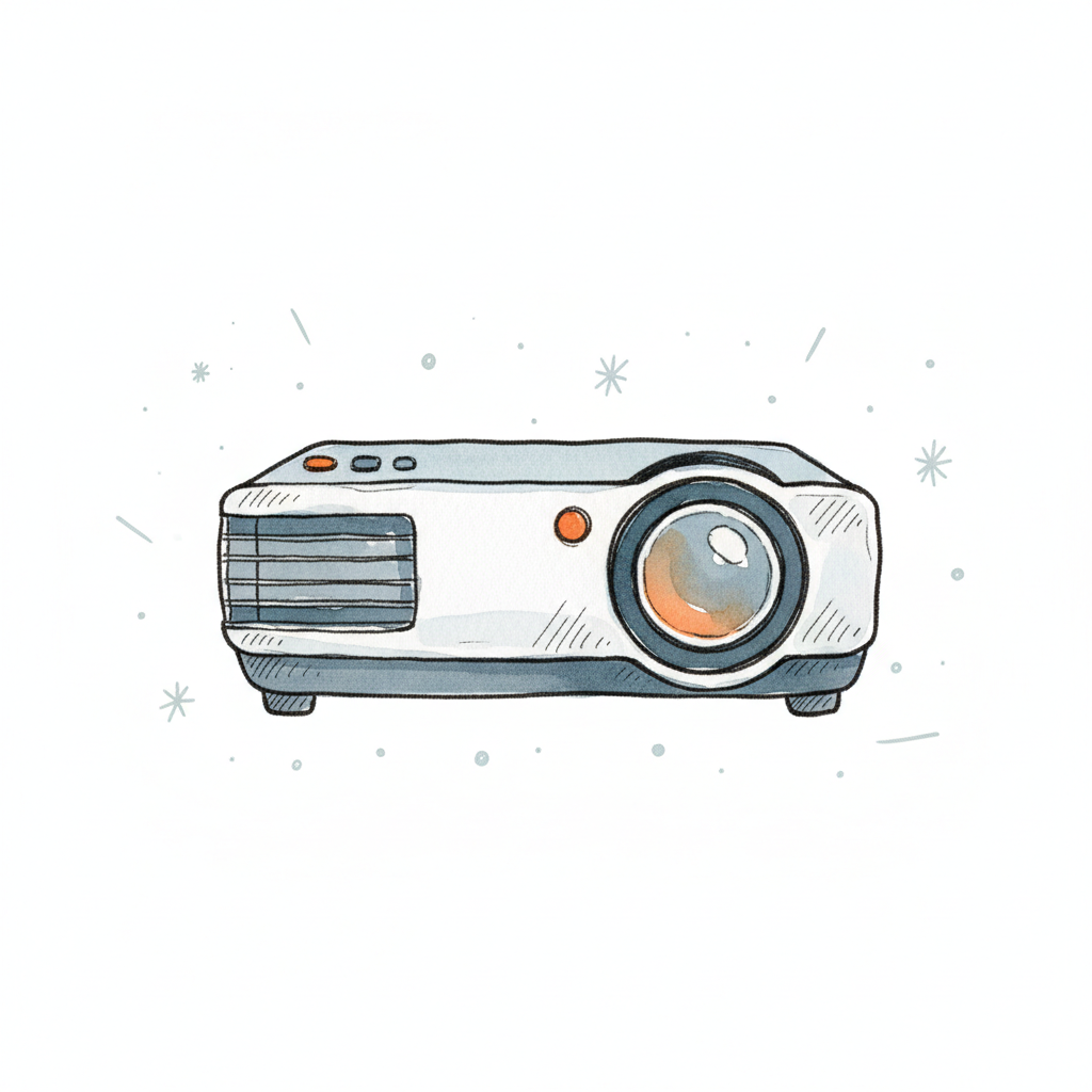 Eine handgezeichnete Illustration eines weißen Projektors mit orangefarbenen Akzenten auf weißem Hintergrund.