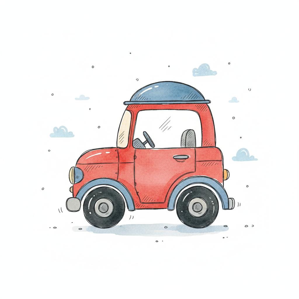 Niedliche Aquarell-Illustration eines roten Cartoon-Autos mit blauen Akzenten auf weißem Hintergrund.