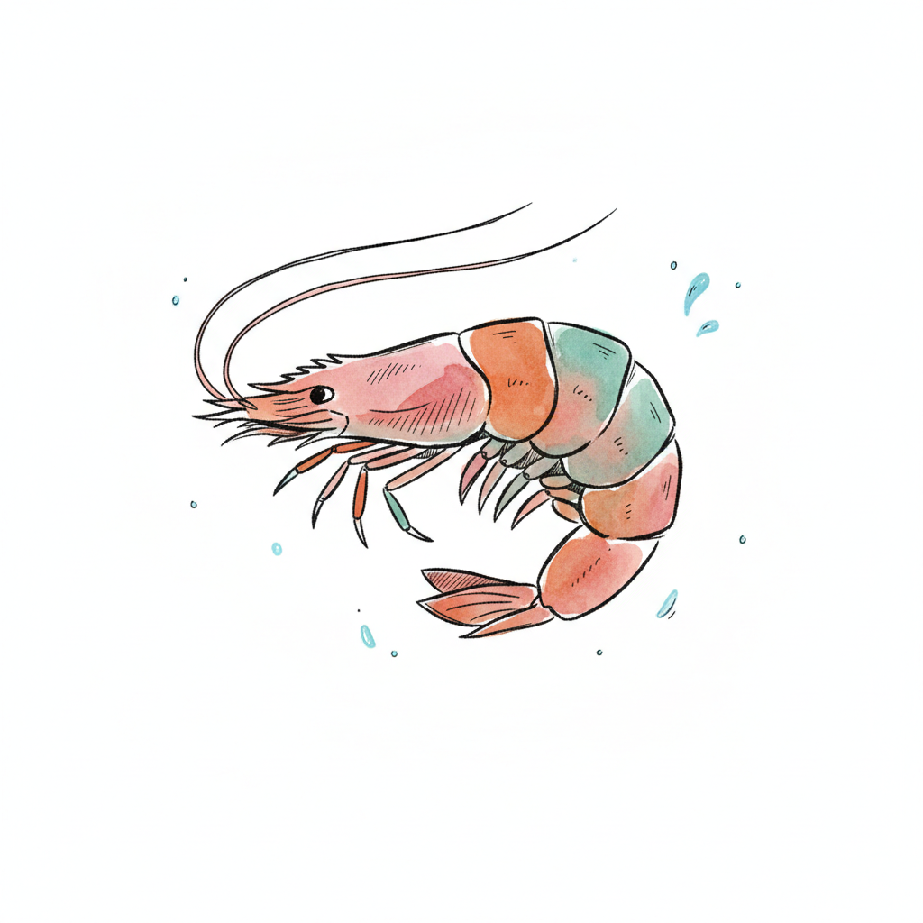 Aquarell-Illustration einer Garnele mit rosa-grünen Segmenten und Wasserspritzern auf weißem Grund.