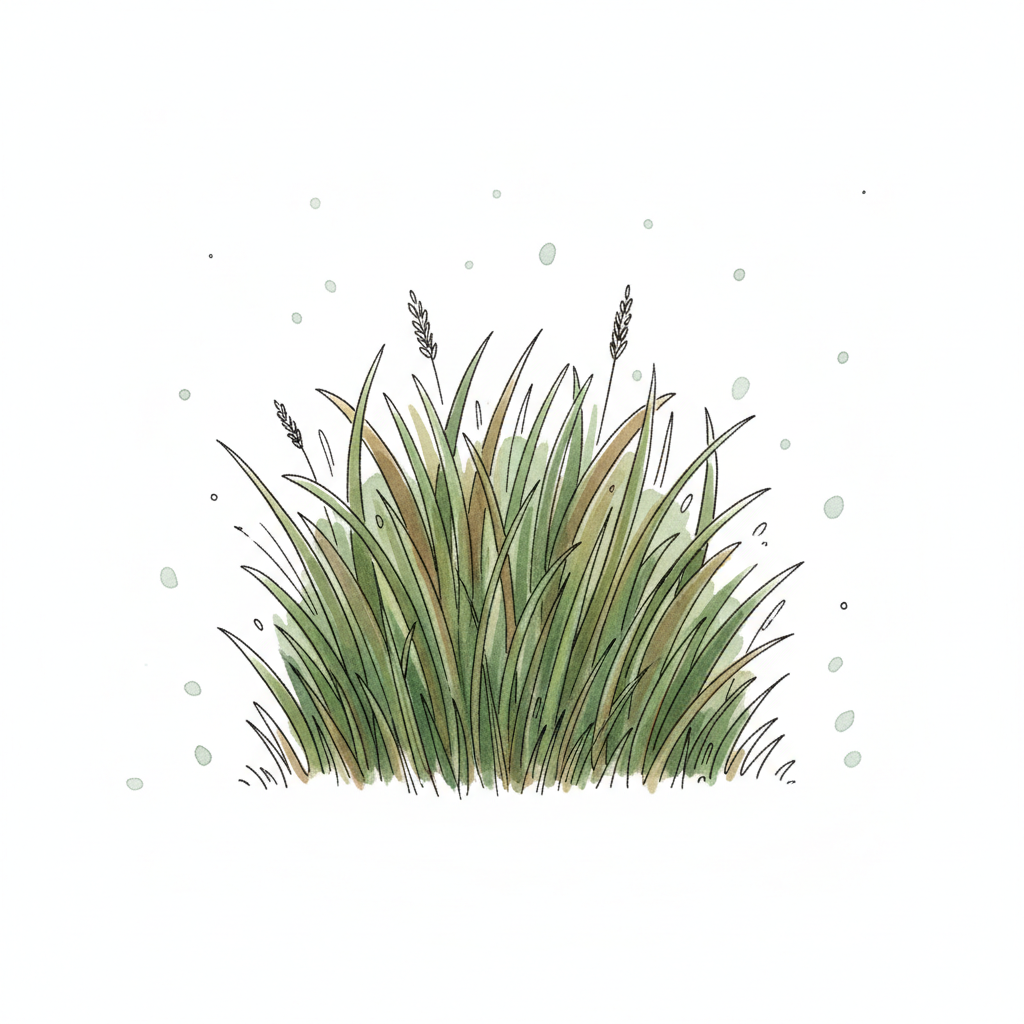 Aquarell-Illustration eines grünen Grasbüschels mit braunen Akzenten und kleinen Ähren.