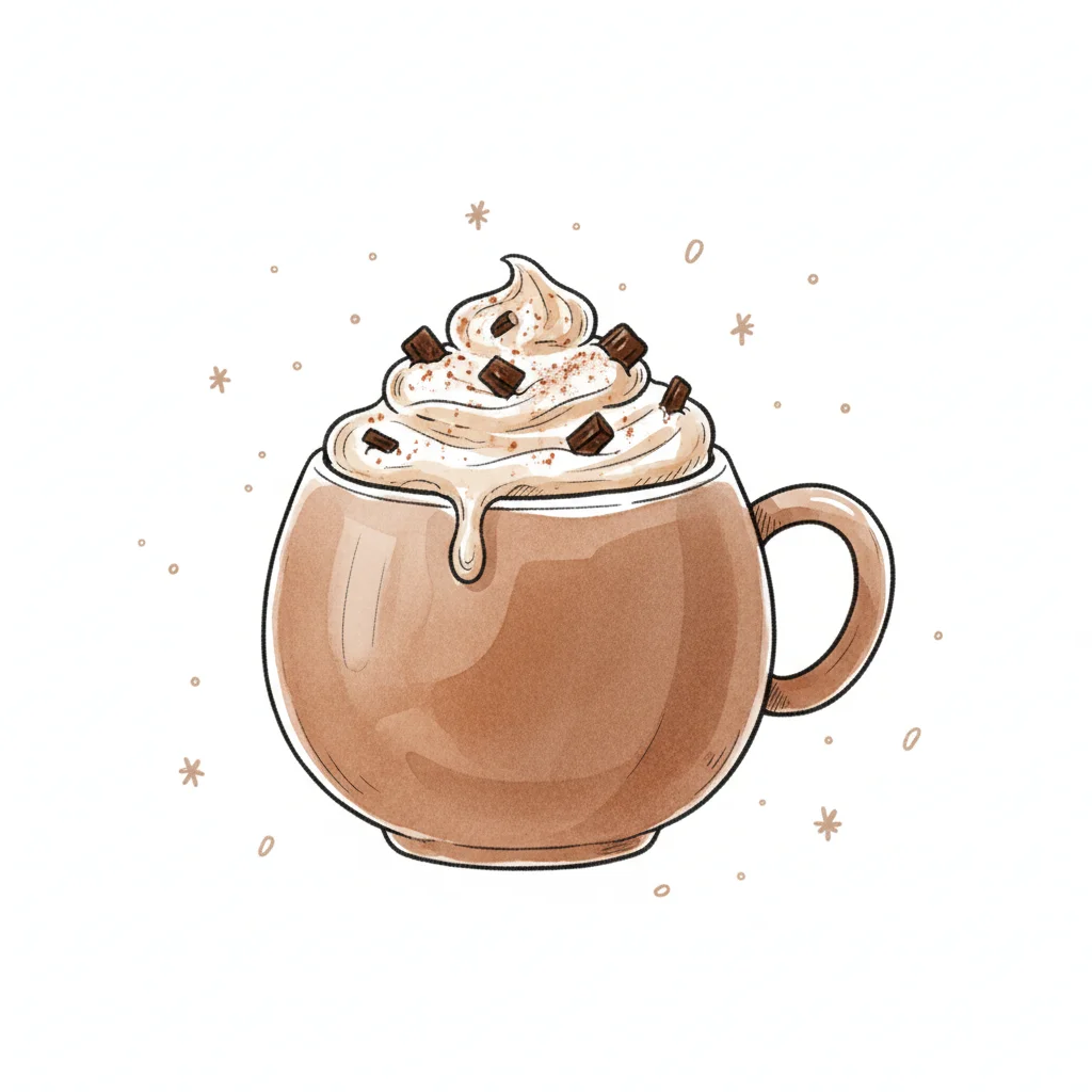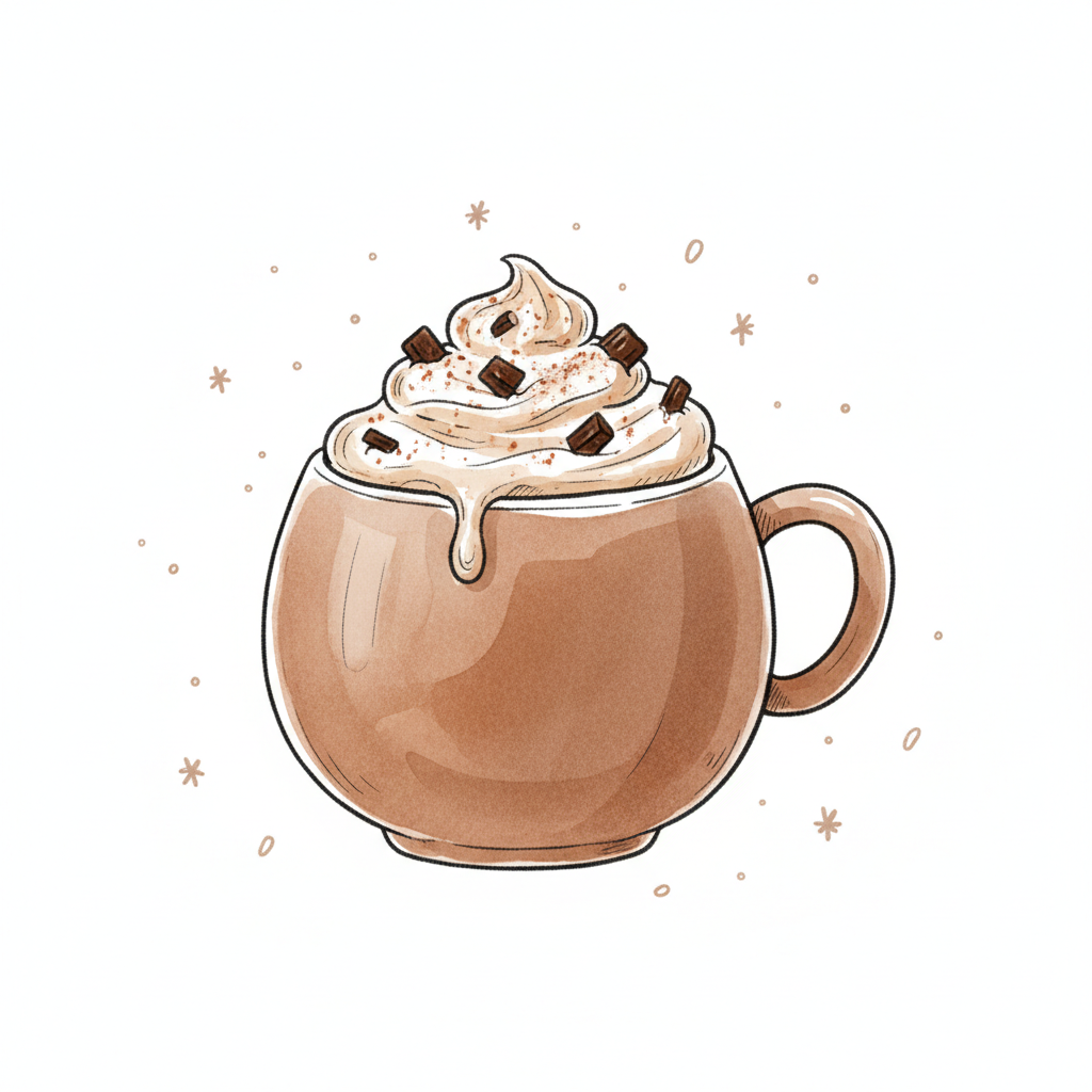 Illustration einer Tasse heißer Schokolade mit Sahne, Schokostückchen und winterlichen Akzenten.